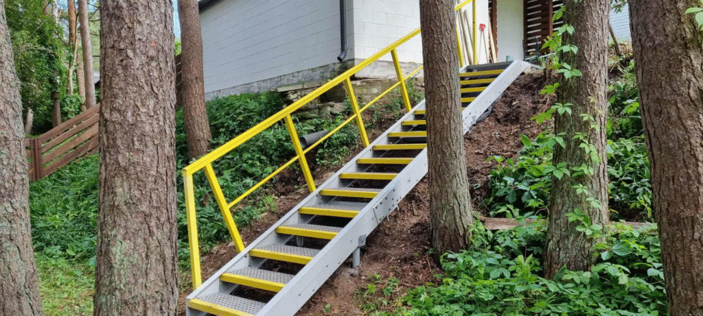 We installed fiberglass stair treads in a client’s backyard, providing a safer and more durable solution for everyday use. Anti-slip