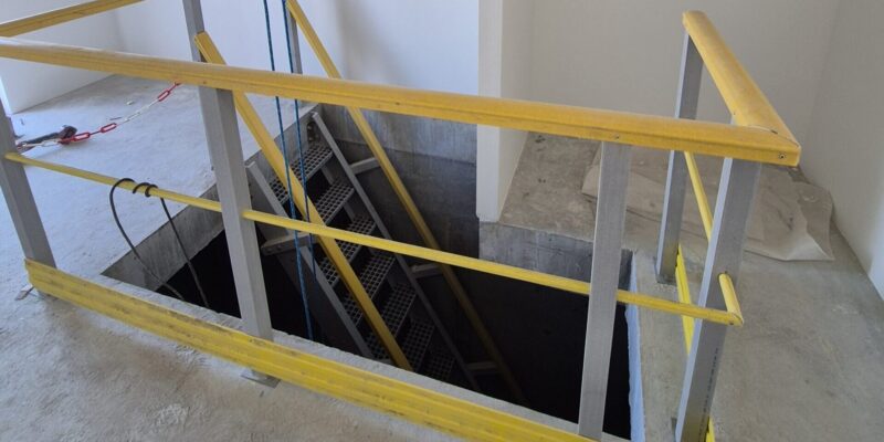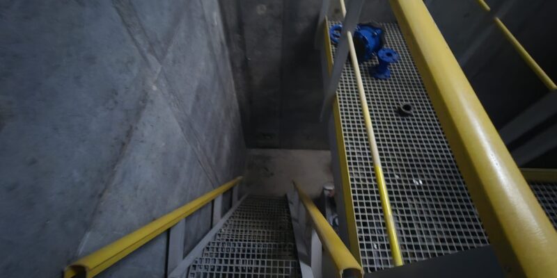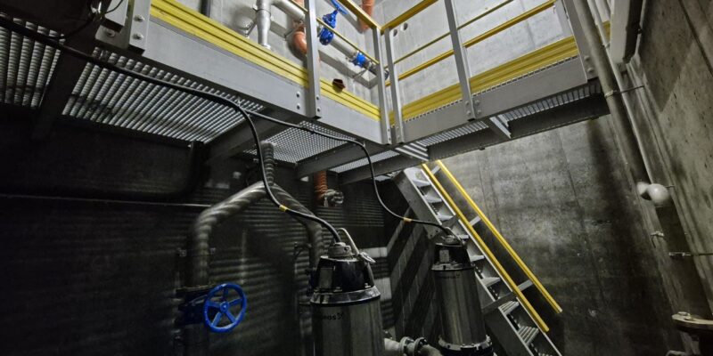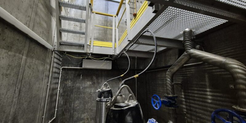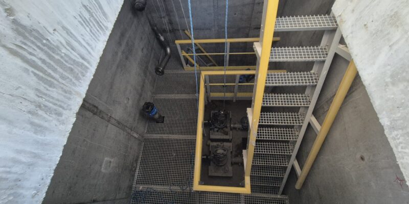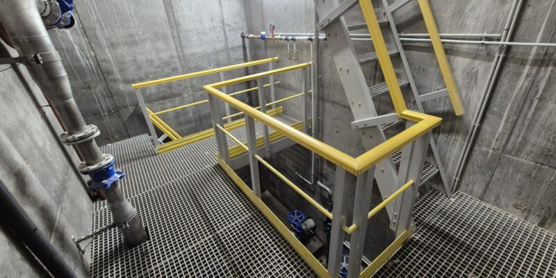 Asensimme jätevedenpumppaamoon kaksi lujitemuoviportasta ja kaiteilla varustetun alustan varmistaaksemme kätevän ja turvallisen pääsyn huoltotöihin. Lujitemuovi on kevyt, kestävä ja korroosionkestävä materiaali, joka sopii erinomaisesti kosteisiin tiloihin. Portaat ja alusta on ergonomisesti suunniteltu, minkä ansiosta työntekijät voivat liikkua helposti ja turvallisesti jätevedenpumppaamolla. Kaiteet lisäävät suojaa ja vähentävät onnettomuusriskiä. Tämä ratkaisu parantaa merkittävästi työturvallisuutta ja työympäristön viihtyvyyttä.